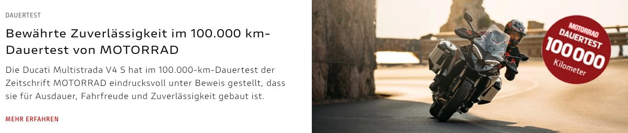Die Multistrada V4 hat im 100.000-km-Dauertest der Zeitschrift MOTORRAD eindrucksvoll bewiesen, wofür sie gebaut ist: Zuverlässigkeit, Fahrfreude und Ausdauer – ohne große Mängel.